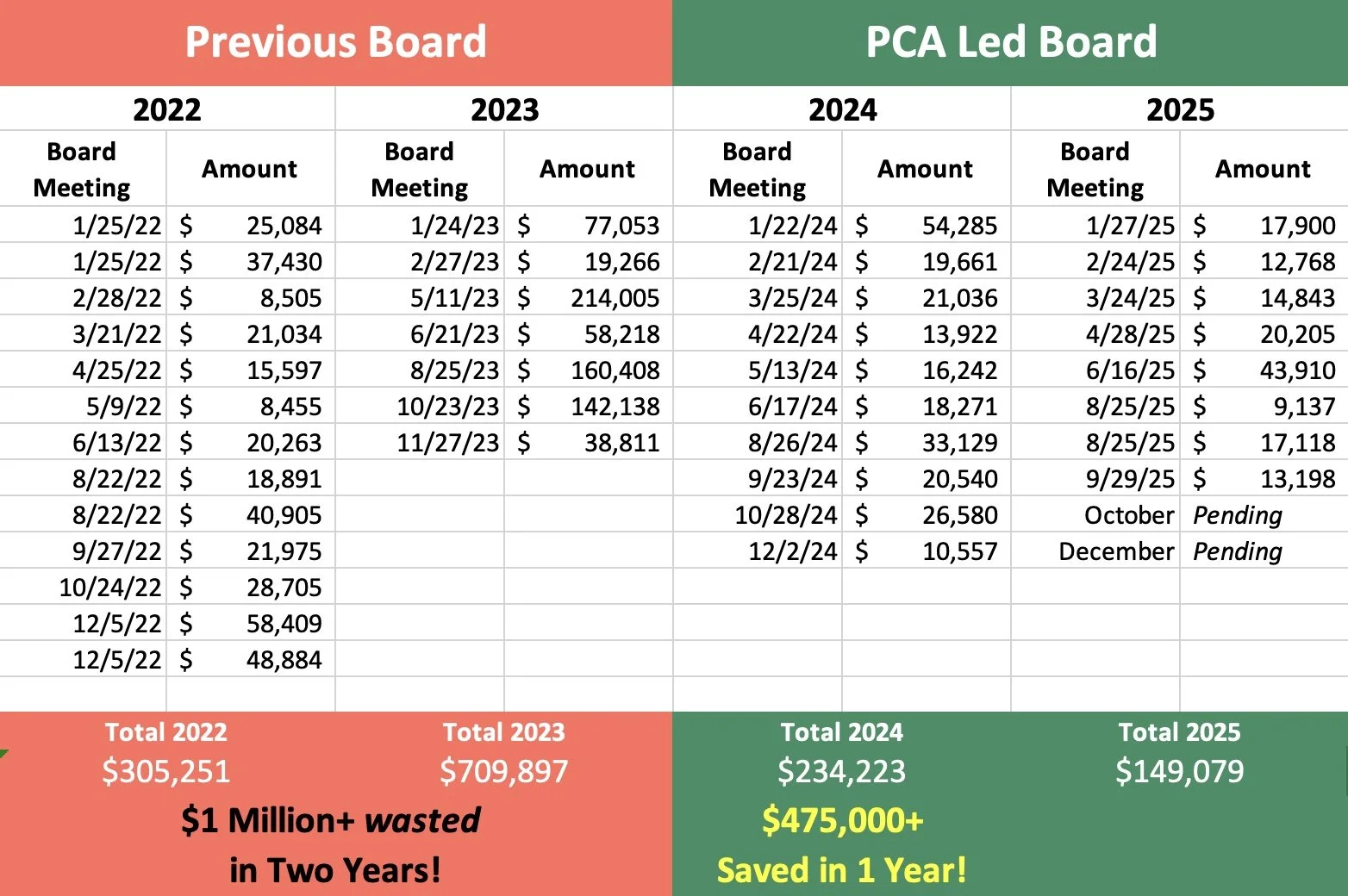 The previous School Board Majority led by our opponents’ allies spent an excessive amount of taxpayer money on legal fees.
